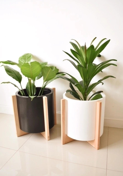Maceta cilíndrica de plástico rotomoldeado de 30cm de diámetro y base de madera de eucalipto macizo.