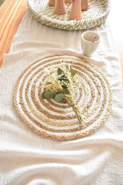 Individual de yute combinado natural y blanco. 30cm de diametro